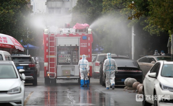 早上7点到9点是集中消杀时间。我作为指挥员,负责整个团队的协调指挥。消杀团队中,一名队员驾驶消防车对主干道及两侧喷洒消毒水进行大面积消杀,两名安全员负责前后道路引导和疏散人群,还有一名通讯员负责跟疫情防控部门保持联系。消杀工作必须彻底,遇到巷道,我指挥司机换开小车进行消杀,对于一些车辆到不了的地方,我带人背着喷壶设备进行人工消杀。