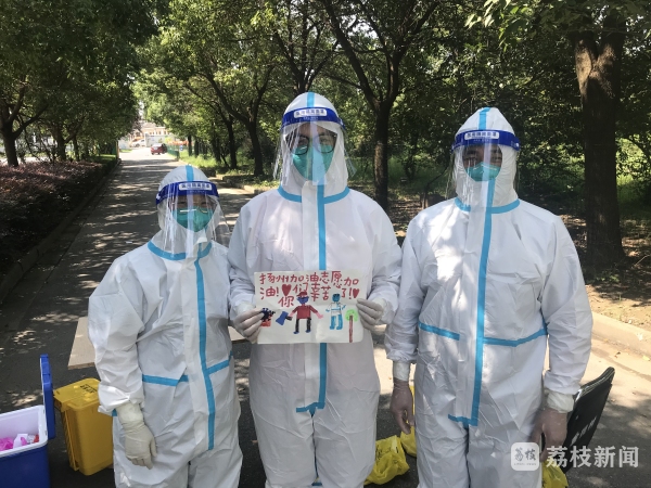 “这是给所有医护工作人员和志愿者们的暖心鼓励,从7月28日邗江区第一轮核酸检测开始,我们陆陆续续收到了许多来自普通群众温暖的鼓励,每完成一次采样,大家都会很礼貌地对我们说谢谢.一些阿姨怕我们中暑,一直在询问我们要不要冰袋,想为我们扇风,真的特别暖心!”回忆起十多天的志愿时光,已经连续参加了十轮核酸检测志愿服务的李子丰说,还有很多小朋友特地来和我们敬礼比心,真是太可爱了,感觉超级治愈!