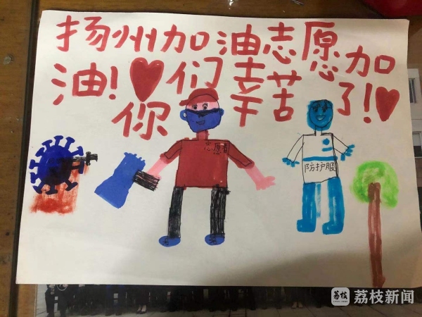 “谢谢叔叔阿姨给我们做核酸!你们辛苦了!”今天(8月17日),扬州市邗江区西湖镇金槐村的核酸检测采样现场,来自扬州大学广陵学院的大三学生李子丰开心地展示着一位小朋友特地送来的暖心手绘,防护面罩下的眼睛里透出满满的惊喜与感动。