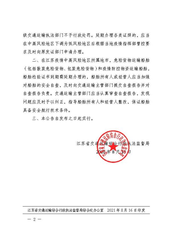 公告指出,在江苏疫情中高风险地区交通运输主管部门签(核)发的船舶、船员、船公司等有关证照证书,因疫情防控期间到期无法按期办理年检、审核或者换发的,可延期办理,各级交通运输执法部门不予行政处罚。延期办理各类证照的,应当在中高风险地区下调为低风险地区后根据当地疫情指挥部管控要求及时向原发证部门申请办理。