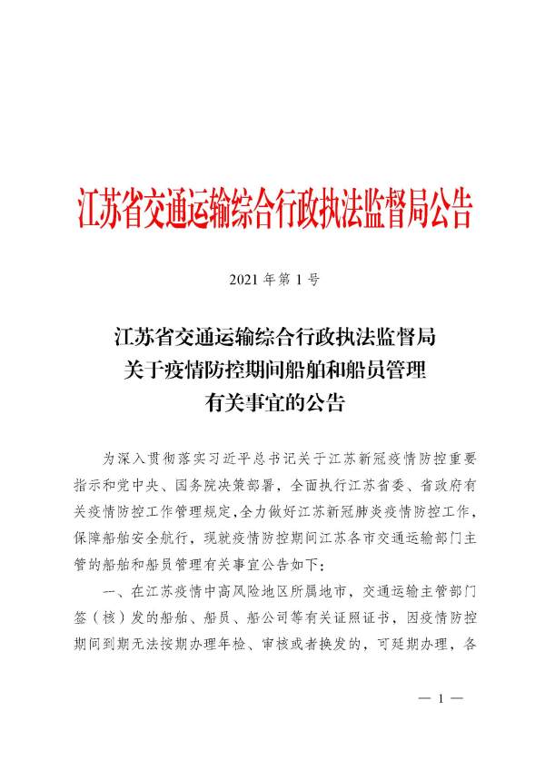 为全力做好江苏新冠肺炎疫情防控工作,保障船舶安全航行,8月16日,江苏省交通综合执法监督局发布公告,进一步做好船舶和船员的管理便民服务。