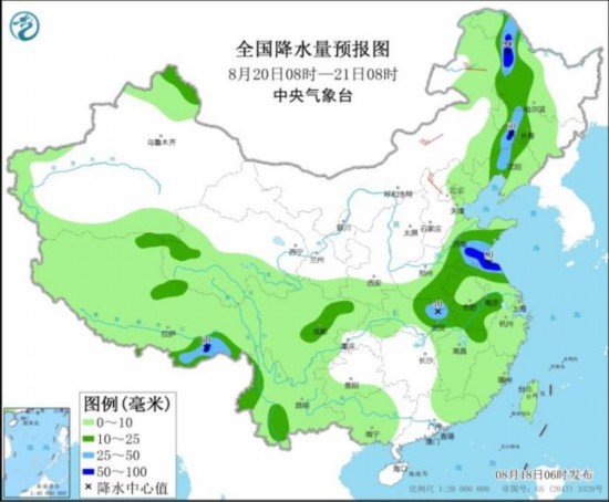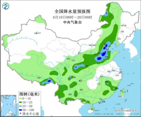 8月19日08时至20日08时,内蒙古东部、东北地区西部、西北地区东南部、华北大部、黄淮北部、西藏东部、云南西部和南部等地部分地区有中到大雨,其中,山西东南部、河北中南部和东北部、天津、山东西北部、河南北部等地部分地区有暴雨(50~90毫米)。内蒙古部分地区有4~5级风。