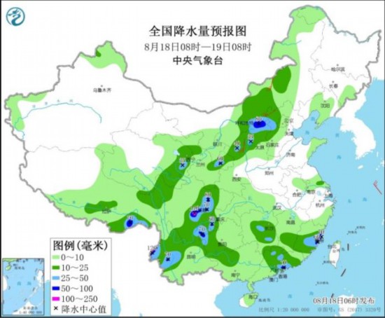 8月18日08时至19日08时,青海东部、宁夏南部、陕西北部、华北中北部、西藏东部、西南地区东部和南部、江南中南部、华南东部等地部分地区有中到大雨,其中,内蒙古西部偏东、山西北部、福建东部、广东东部、四川盆地西南部、贵州西北部、云南东北部和西南部等地部分地区有暴雨或大暴雨(100~140毫米)。内蒙古中部、陕西北部、河北北部等地部分地区有4~5级风。