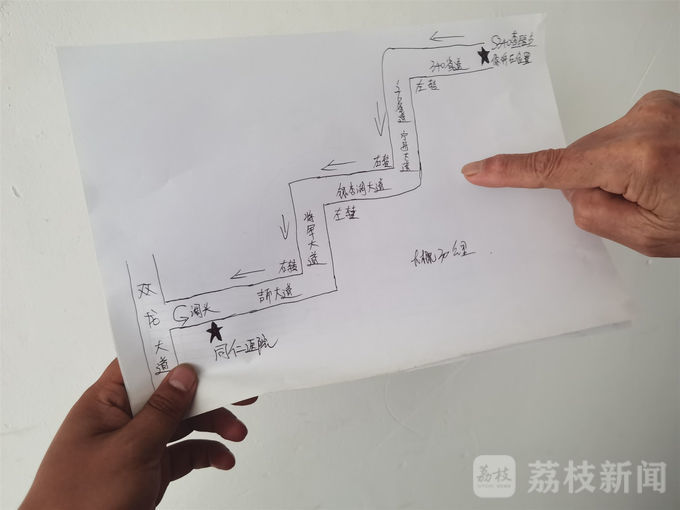 这张地图是7月25号上午,340省道查验点工作人员绘制的。当日,工作人员查验到一个皖K打头的车辆,该车辆经过查验点时48小时核酸检测报告已经过期,根据规定必须劝返,但因为驾驶员是外地人,岁数也比较大,使用老人机,对周围的情况不太熟悉。工作人员就当场拿了张纸,在上面写一写、画一画,一边讲一边说,指导驾驶员到定点医院检测。后来,驾驶员很高兴地按照这张手制地图进行了核酸检测。