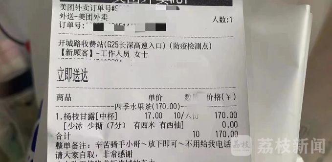 工作人员的辛苦付出,同时也得到了群众的热情反馈。前两天晚上6点半,工作人员在绕越高速麒麟查验点收到了一份外卖,这是群众给查验人员送来的“秋天第一杯奶茶”,外卖的单子单据图片上面写了“放下即可,不用电话给我,你们随便自取”。这些微小的举动令工作人员十分感动。还有的企业为了协助查验点的交通指挥工作,在原来的监控设备基础上,又免费安装了20套监控设备,让工作人员能够时刻看到每一个查验点的工作情况。“这些都是群众对我们抗疫工作的支持和理解,也是全社会共同抗疫的写照。我相信通过共同努力,一定会战胜疫情!”马明宏说。