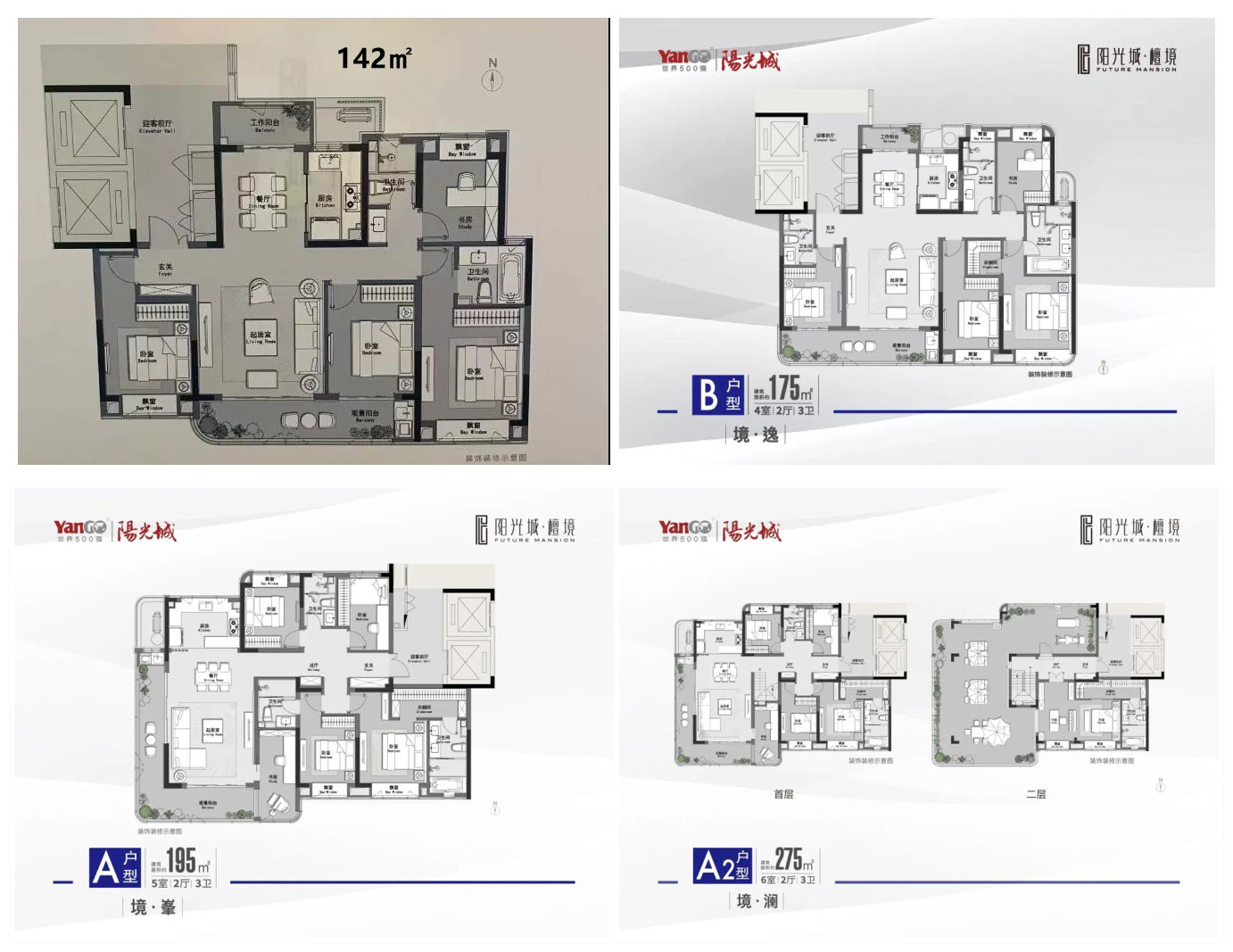 阳光城檀境预计9月首开,一次性推出3栋楼所有148套房源,户型建面142、175、195㎡,还有3套顶跃户型建面约275㎡,毛坯限价3.4万/㎡,全装修限价3.6万/㎡,精装放风4万/㎡(具体以开发商公布为准)。此外,项目后期还将推出建面约45-90㎡的公寓产品。