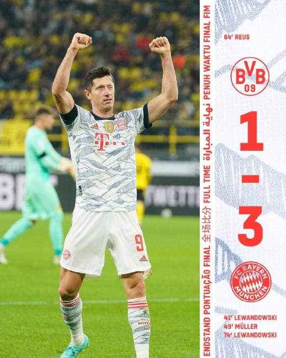 多特蒙德第64分钟扳回一城,贝林厄姆回传,罗伊斯禁区弧边缘射入右上角,1:2。第74分钟,阿坎吉传球被托利索封挡后偏转,莱万禁区右侧射入近角,3:1,拜仁就此锁定胜局。