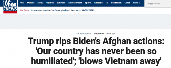 特朗普还在采访中谈及阿富汗喀布尔机场的乱象,说道:“你面对的是成千上万的美国人和其他人,他们被困在阿富汗,处境非常危险……这是你甚至不敢相信的事情。”“我昨天看到了那架巨大的运输机,人们抓住飞机的一侧,试图飞离阿富汗,因为他们感到难以置信的恐惧。他们从2000英尺的高空掉落,没有人见过这样的事,”特朗普说,“这是我所见过的最令(美国)丢脸的时候。”