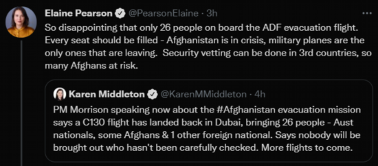 值得一提的是,英国《卫报》随后指出,澳大利亚政府派出的这架(首架)救援飞机为C-130运输机,规定载客量为128人。有人因此在社交媒体上对莫里森政府提出质疑:危机时刻,原本能坐满上百人的飞机却只搭载了26人回澳。↓