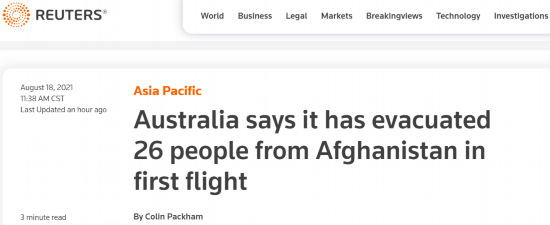 路透社称,当前莫里森正面临着加速撤离本国公民以及这些曾为澳工作的阿富汗人的巨大压力。但是,这位澳大利亚总理曾于17日表态,称该国不太可能有能力帮助所有帮助过他们的人。