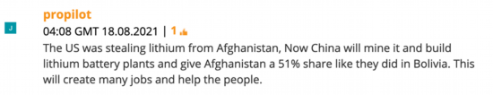 “美国从阿富汗偷锂,现在中国将开采并建造锂电池厂,让阿富汗获得51%的分成,就像他们在玻利维亚做的一样。这将创造许多就业机会,帮助人民。”↓