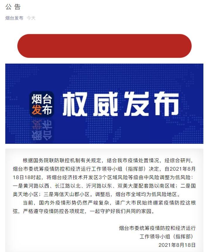 荔枝新闻讯 烟台发布微信公众号8月18日发布公告称:根据国务院联防联控机制有关规定,结合烟台市疫情处置情况,经综合研判,烟台市委统筹疫情防控和经济运行工作领导小组(指挥部)决定,自2021年8月18日18时起,将烟台经济技术开发区3个区域风险等级由中风险调整为低风险:一是黄河路以西、长江路以北、沂河路以东、双美大厦配套路以南区域;二是国奥天地小区;三是海信天山郡小区。调整后,烟台市全域均为低风险地区。