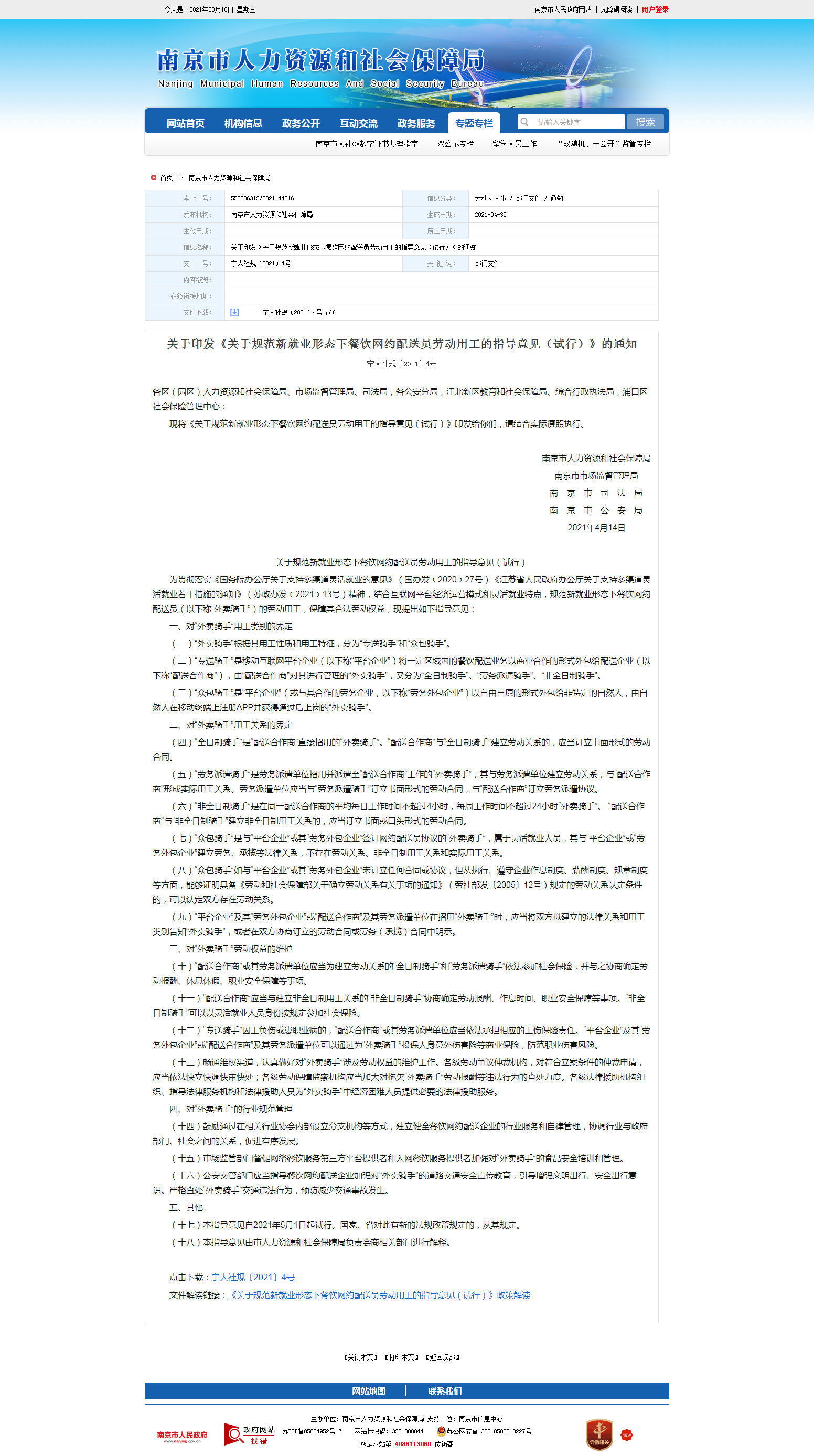 为推进南京市网约配送行业零工群体依法分类规范、劳动关系和谐健康发展,早在今年4月,南京市人社局与市场监管局、公安局、司法局四部门联合出台《关于规范新就业形态下餐饮网约配送员劳动用工的指导意见(试行)》,明确通过筹建行业协会等方式,建立健全网约配送企业的行业服务和行业自律。通过深入走访网络平台企业、开展外卖合作商企业专题座谈,深化沟通交流,加深互信互动。同时,各有关部门协同联动,从加强食品安全培训、开展交通安全教育、提供维权法律援助等多方面引导促进行业健康有序发展,这些都为组建南京网约配送行业协会夯实工作基础。南京网约配送行业协会的成立、运行管理将对平台经济的健康发展和新就业形态劳动者权益的有效维护具有重要意义。