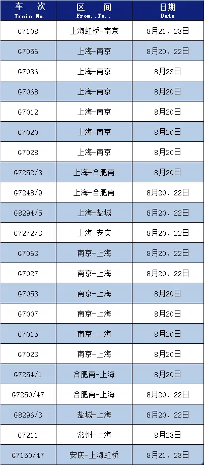 荔枝新闻讯 记者从上海铁路客户服务中心获悉,为方便旅客出行,8 月 20 日起,长三角铁路恢复开行多趟旅客列车,包括南京至上海、盐城至上海、合肥至上海等方向。