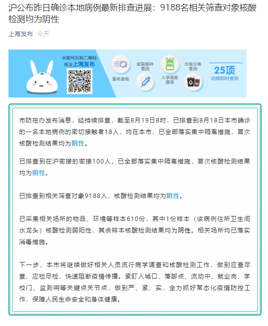 荔枝新闻讯 据“上海发布”微信公号消息,上海市防控办发布消息,经持续排查,截至8月19日8时,已排查到8月18日本市确诊的一名本地病例的密切接触者18人,均在本市,已全部落实集中隔离措施,首次核酸检测结果均为阴性。