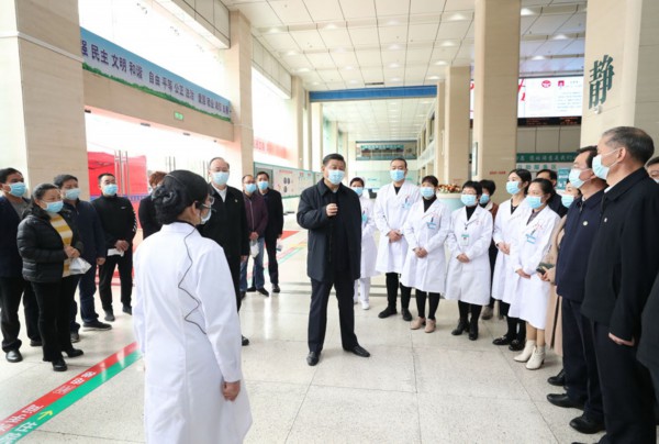 2020年2月10日,习近平在北京调研指导新冠肺炎疫情防控工作。这是习近平来到首都医科大学附属北京地坛医院门诊楼一层运行监控中心,通过监控画面察看患者住院诊疗情况,并视频连线正在病房值班的医务人员。