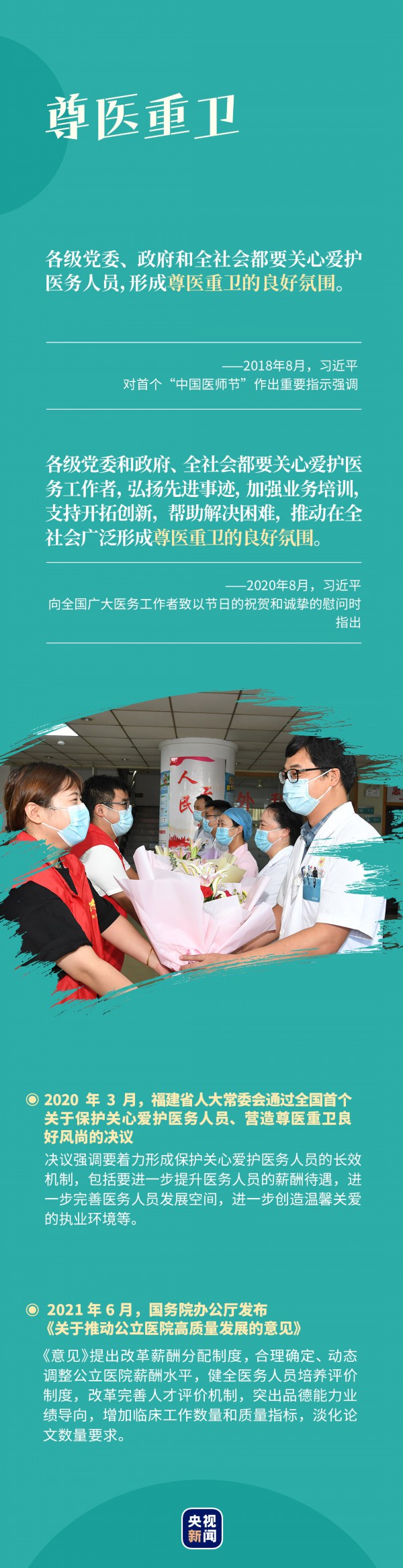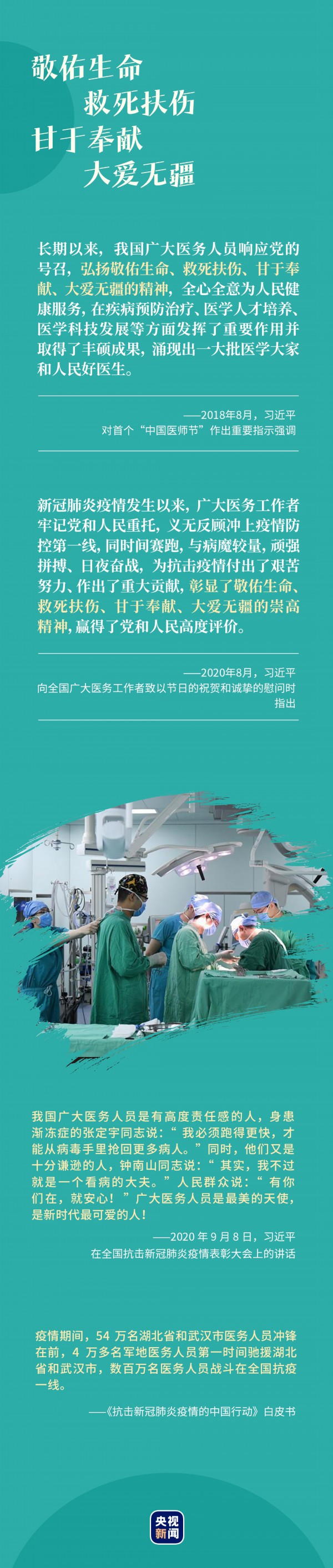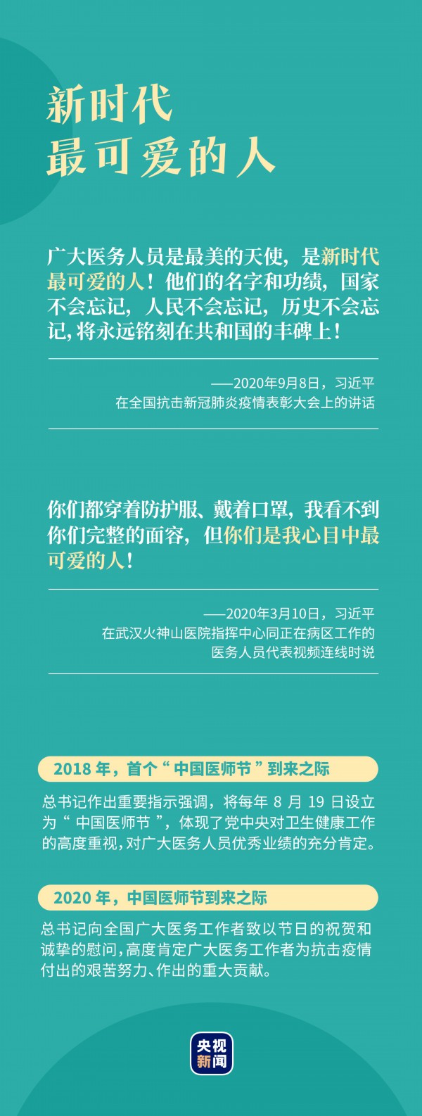 习近平总书记非常关心广大医务工作者,多次作出重要指示、向医务工作者致以慰问,亲切地称赞他们为“新时代最可爱的人”。