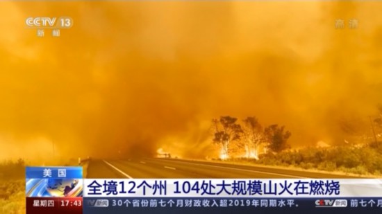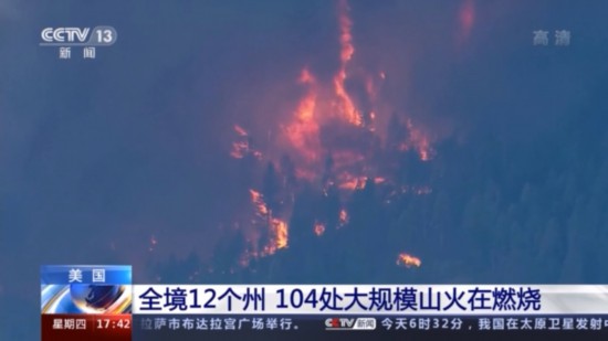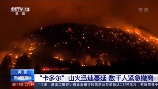 根据美国国家跨部门消防中心18号公布的数据,目前,美国全境内仍有104处大规模山火在燃烧,分布在12个州,过火面积超过9700平方公里。其中,加州新燃起的“卡多尔”山火迅速蔓延。
