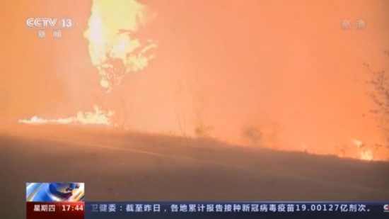 这是一段17号航拍的“卡多尔”山火。画面可以看到,这片森林有多处明火,火势凶猛。在一条盘山路上,浓烟密布,能见度很低,一些山火已经烧到道路两旁。