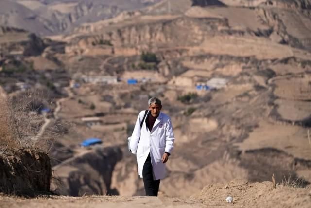 张尚保走在去铁头村张家湾自然村出诊的路上。新华社记者 詹彦摄