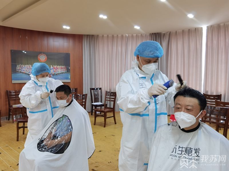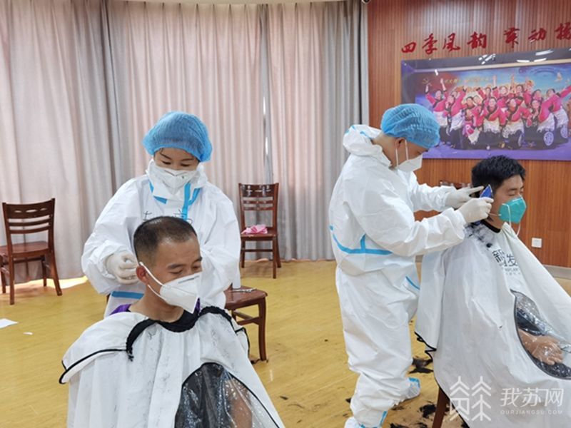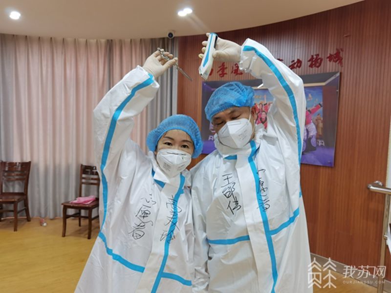 苏北人民医院护理核酸采样人员总队刘霞理发之后,对着镜子左照又照,连连感谢社区志愿者。苏北医院共派出24人医护小分队来到四季园小区。刘霞说,许多医护人员头发长了,不仅粘连着汗水贴在脸上,而且遮住眼睛,很不舒服、很不方便。