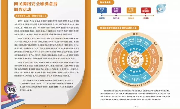 网民网络安全感满意度调查活动由江苏省信息网络安全协会及全国135家网络安全行业协会及相关社会组织共同发起,2020年采集有效样本量150万份,是目前国内调查范围最广、参与人数最多的全国性公益网络安全社会调查活动。活动一方面搭建了全民共治共享平台,通过开展切实深入到寻常百姓中的民意调查,形成“听民声→诉民愿→解民忧→纾民困”闭环,让网民说事有门、办事有人、难题有解;另一方面,每年调查活动的数据及分析报告,可为政府、企业、相关机构提供决策参考、科研支撑、成果应用。通过社会组织聚合政府、企业、媒体、相关机构及网民的力量,以网情民意数据推动网络社会治理,助力构建国家网络安全同心圆。