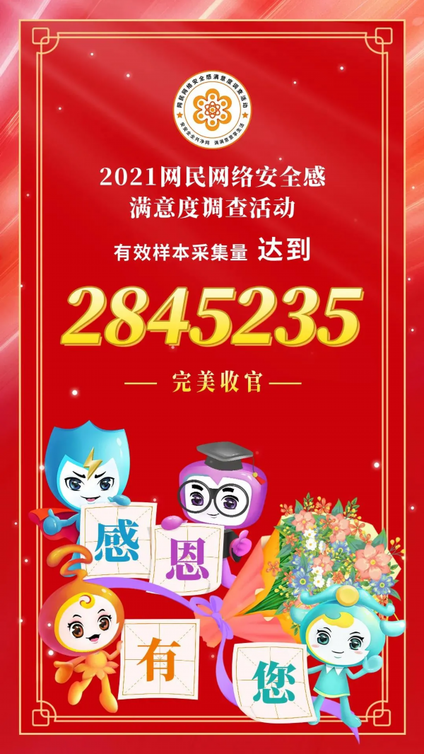 为期10天的“2021网民网络安全感满意度调查活动”调查样本集中采集于8月12日24时圆满结束,最终收集到的样本总量突破284万份!调查覆盖全国34个省市自治区及部分海外地区,全国各地网民踊跃参与。