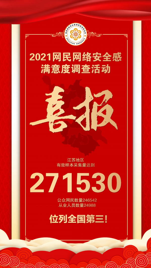 江苏省有效样本采集量达到271530份,其中公众网民数量246542份,从业人员数量24988份,占全国样本总量的9.54%,位列全国第三!江苏省信息网络安全协会作为发起单位,在江苏省公安厅网安总队指导下连续四年参加调查活动。相较于往年,2021调查活动样本采集数量更高、覆盖面更广、问卷内容更全面,网民参与度和实时互动性更强。各参与单位高度重视,积极响应,通过多方联动、多样渠道、多种方式激活网民参与调查活动的热情,积极发动网民参与调查,最终完美收官。