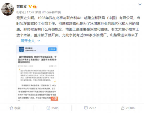 值得注意的是,在此前因“双标”质疑登上热搜榜之后,曾锡文曾通过微博“喊冤”,他表示“为了保证梦龙的高端质量,我们兢兢业业,一丝不苟。用最好的比利时巧克力,最佳的冰淇淋来生产。为了满足中国消费者口味,中国市场的梦龙产品使用的巧克力要比欧洲梦龙产品多11%。多放这么多巧克力我们都不心疼,还会在其他辅料上打主意?”