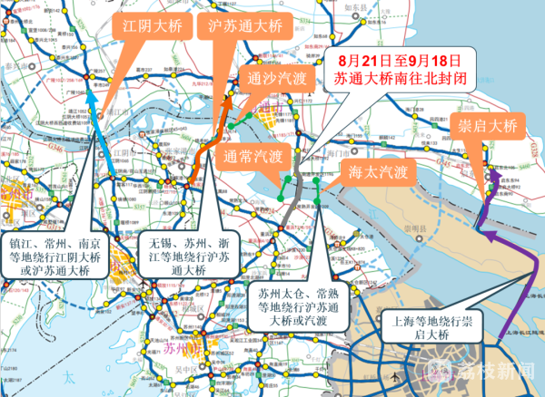 从2021年8月21日零时至2021年9月18日24时期间,G15沈海高速苏通大桥段(从南往北方向)将实行2021年集中养护施工。