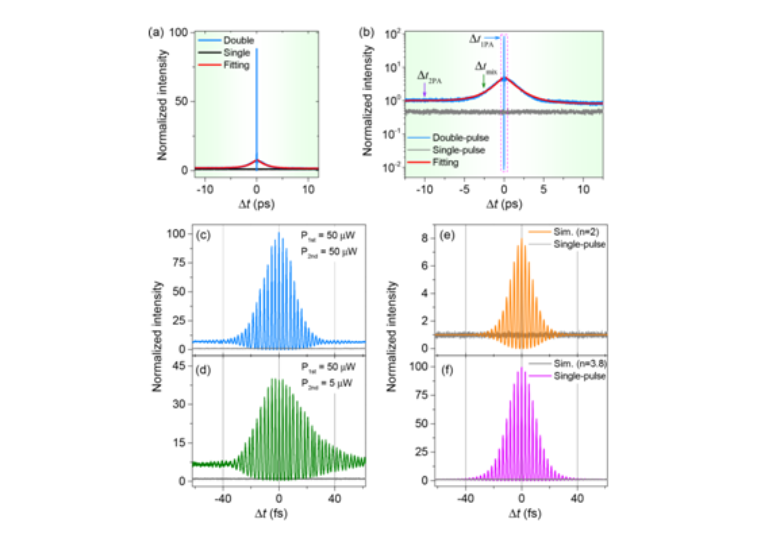 图1金纳米粒子在不同时间尺度下的超快动力学行为。(a) 线性坐标;(b) 对数坐标。(c) 两束等功率飞秒脉冲激发下的对称干涉条纹;(d) 不等功率激发下的非对称干涉条纹。传统多光子激发模拟结果:(e) n=2,(f) n=3.8。