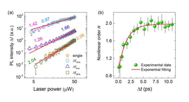 研究工作同时表明,通过精确调控两束飞秒激光的延迟,可以精准地调控飞秒激光与金纳米粒子相互作用的非线性系数。如图2所示,使用单束飞秒脉冲激发金纳米粒子时,其荧光表现出明显的双光子吸收过程,非线性系数为2;在采用双脉冲激发时,当仅改变其中一束飞秒激光功率时,金纳米粒子的荧光随两束脉冲延迟的增加呈现出从线性过程向双光子过程渐变的奇异行为。在金纳米粒子的实际应用中,线性过程适用于精密测量与传感,而高阶非线性过程对超分辨成像更为有利。