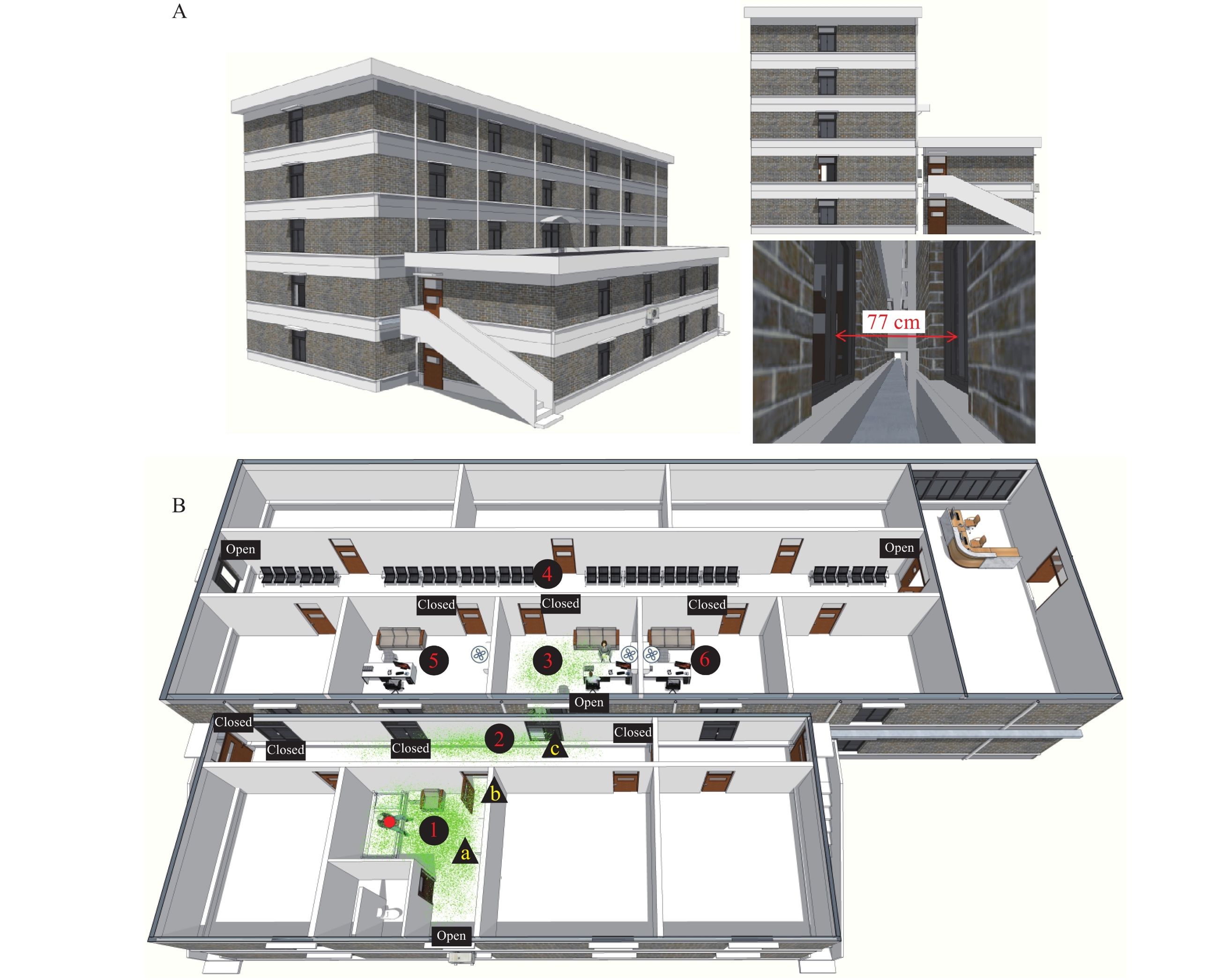 在建筑物的内部房间布局中,地点1-6是试验地点。三角形(a-c)是影响气流分布的因素:(a)空调,(b)门;(c)窗口。红点是雾化器所在的位置。风扇符号显示空调已打开。绿色颗粒是荧光微球,模拟指示病例呼出的病毒气溶胶和传播扩散路径。