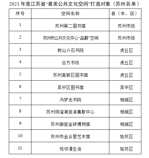 近日,省文旅厅公布了2021年度江苏省“公共文化空间”打造对象名单,苏州市共有22个项目入选。