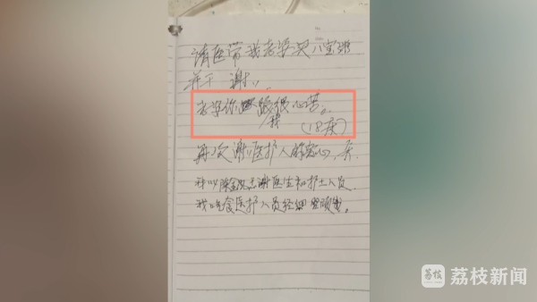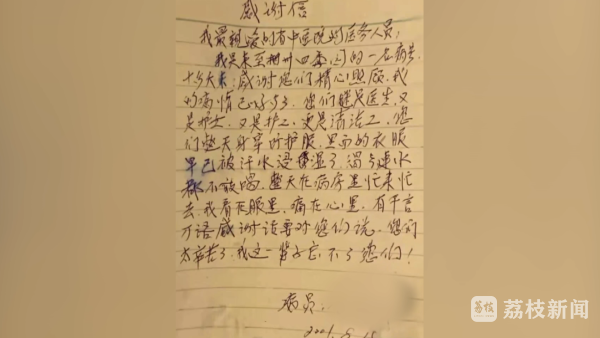 前几日,医生查房时,一位83岁的患者塞过来一张纸条,医生以为患者又有了需求,打开一看,竟是一封感谢信。上面写着:我最亲爱的省中医院的医务人员:我是来自扬州四季园的一名病号,十多天来,感谢您们精心照顾,我的病情已经好多了。