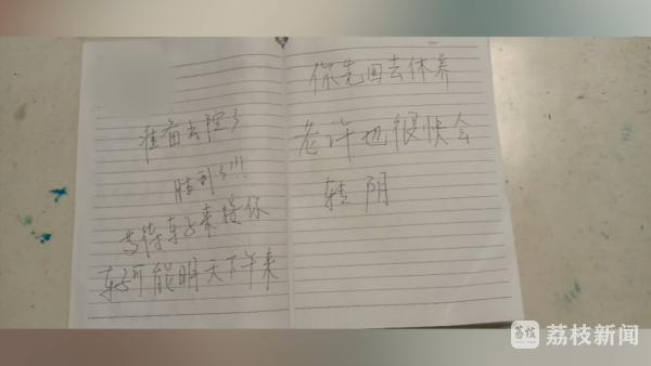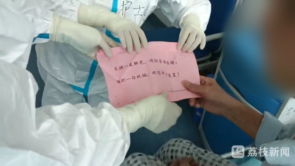 在南京市公共卫生医疗中心,江苏省中医院医疗队负责的病区,有不少60岁以上的老人,因为方言、听力下降等原因,医患交流起来有点困难。医护们灵机一动,想出了写小纸条的方式。前几日,一位患者塞给医生一张小纸条,医生以为是有什么需求,打开一看,竟是一封感谢信。8月21日,医护们精心准备了一张张爱心祝福纸条,为患者们加油打气。