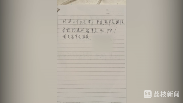 这两天,医护们专门准备了爱心寄语的本子,放在护士站。短短几天,本子上密密麻麻记下了很多:"你先回去休养,老许也很快会转阴 ""老婆,你跟我很辛苦"……患者们把不能言语的思念,都写了下来。