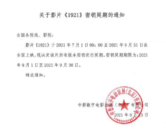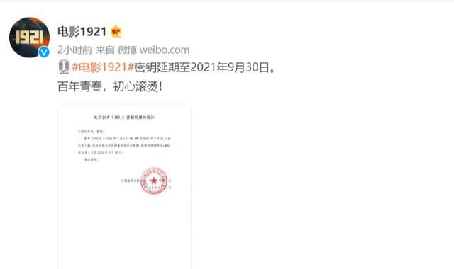荔枝新闻讯 据@电影1921微博消息,8月23日,电影《1921》宣布密钥延期,将延长上映至9月30日。