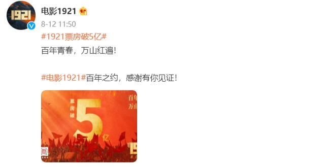 《1921》是由黄建新执导,余曦、赵宁宇、黄建新编剧,黄轩、倪妮、王仁君、刘昊然、陈坤、李晨、王俊凯、胡先煦等主演的献礼建党100周年的历史剧情电影。另据其官微消息,该片7月1日正式上映,截至8月12日累计票房已破5亿。