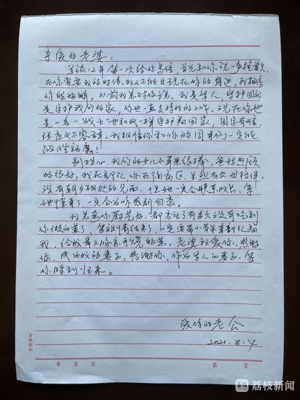 去年参加抗疫时,打了入党报告的胡笛告诉记者,作为入党积极分子这个时候就要上,冲锋在一线。接到院方通知后,胡笛第一时间收拾行囊奔赴抗疫“战场”。4号,就在胡笛转入重症病房时,作为军人的丈夫手写了一封信给她,丈夫的支持让胡笛非常欣慰。