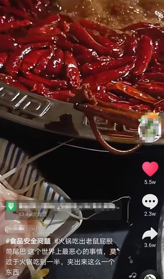 近日,重庆的小唐报料称,他8月21日在重庆临江门桥头老火锅鸳鸯店吃火锅时吃到老鼠尾巴,火锅店店长当天支付1千元体检费给小唐,但小唐与火锅店后续协商得并不愉快。火锅店认为小唐是在敲诈,称已报警,而小唐认为火锅店的行为对他的精神和名誉造成了损伤,自己索赔1万元并不过分。截至目前,双方仍在僵持。