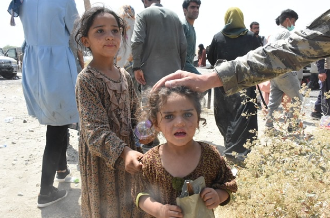当地时间2021年8月22日,阿富汗喀布尔,喀布尔国际机场附近,阿富汗儿童正在接受土耳其士兵分发的水和食物。 视觉中国 图