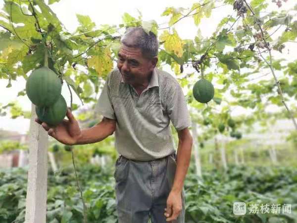 8月22日上午,泗阳县庄圩乡大楼社区河涯片9组67岁居民庄召许在瓜蒌地一边查看瓜蒌长势,一边同邻组居民潘家浪自豪地说道。