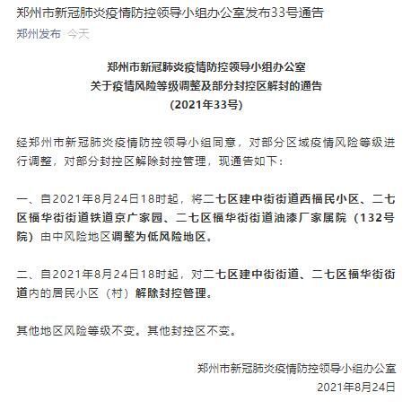 一、自2021年8月24日18时起,将二七区建中街街道西福民小区、二七区福华街街道铁道京广家园、二七区福华街街道油漆厂家属院(132号院)由中风险地区调整为低风险地区。