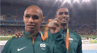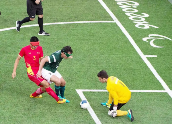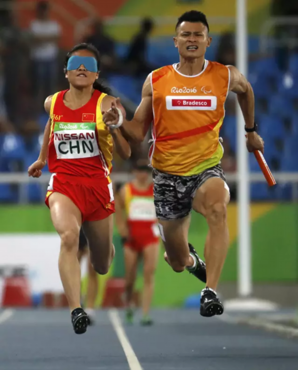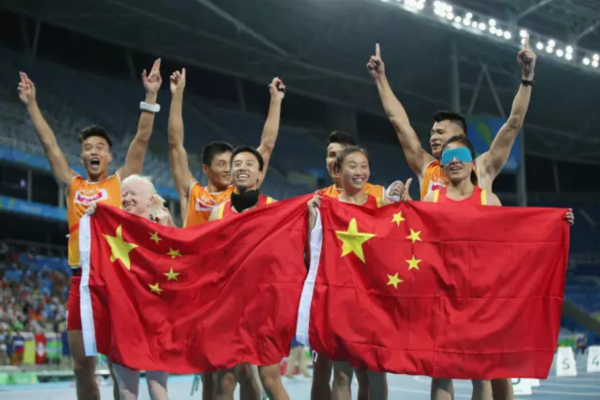 中国盲人女子接力队的四位姑娘登上了冠军领奖台和她们的四位领跑员