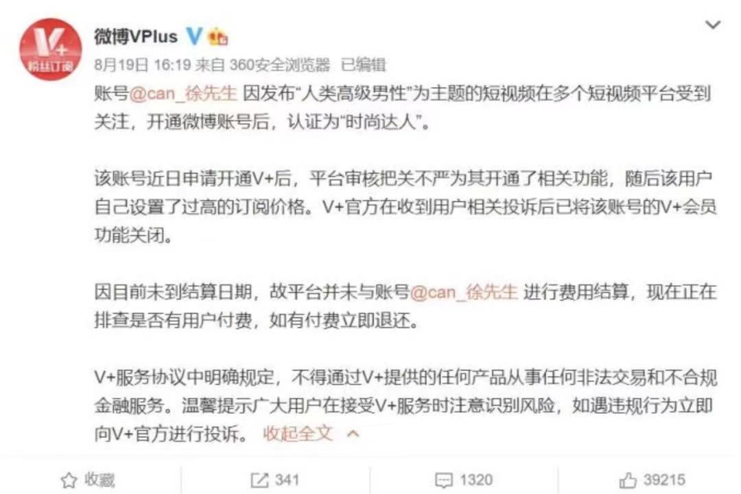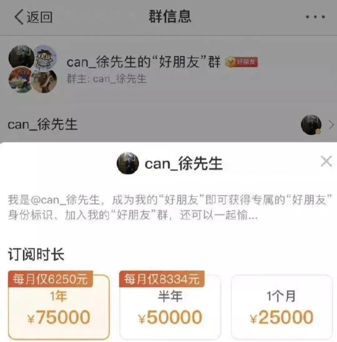 有了从天而降的大量粉丝,有了人气,就该“摘果实”了。果然,徐勤根靠着作丑快速积累了粉丝,其中微博就有49万,他开始接商业广告,是一个啤酒品牌。而且平台也是逐利的,甚至还有平台给他开设了“求偶专场”直播。这些还不够,徐勤根又开通了微博V+会员功能,试图为粉丝提供金融领域的高额付费服务。据媒体报道,如果想要进入他的粉丝群,每人每年的费用为7.5万元,半年的费用为5万元,1个月的费用也高达2.5万元。曾有网友问:“这么贵的群有啥好处?”徐勤根回答称,“主要涉及全球及国内金融衍生品交易这块,国内外二级市场投资信息和情报支持,以及重要的经济领域信息,以及咨询服务。”目前这条微博已删除。因为8月19日下午,官方账号@微博VPlus发动态称,在收到用户相关投诉后已将该账号的V+会员功能关闭。V+服务协议中明确规定,不得通过V+提供的任何产品从事任何非法交易和不合规金融服务。可见,这一切都是急吼吼的流量变现的套路。