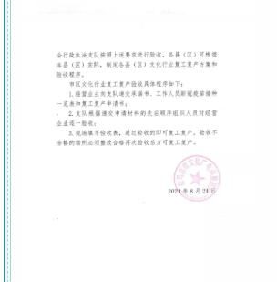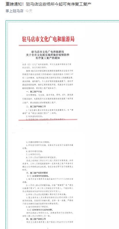荔枝新闻讯 据“掌上驻马店”微信号消息,驻马店文化和旅游局今日发布了一则关于全市文化娱乐场所做好疫情防控有序复工复产的通知。按照《驻马店市新冠肺炎疫情防控指挥部办公室关于科学规范开展社会防控工作的通知》(驻疫防指办〔2021〕47号)文件精神,低风险地区重点场所在采取人员健康监测、清洁消毒、通风换气、个人防护等防控措施前提下,适时开展疫苗预防接种,场所正常经营或开放。