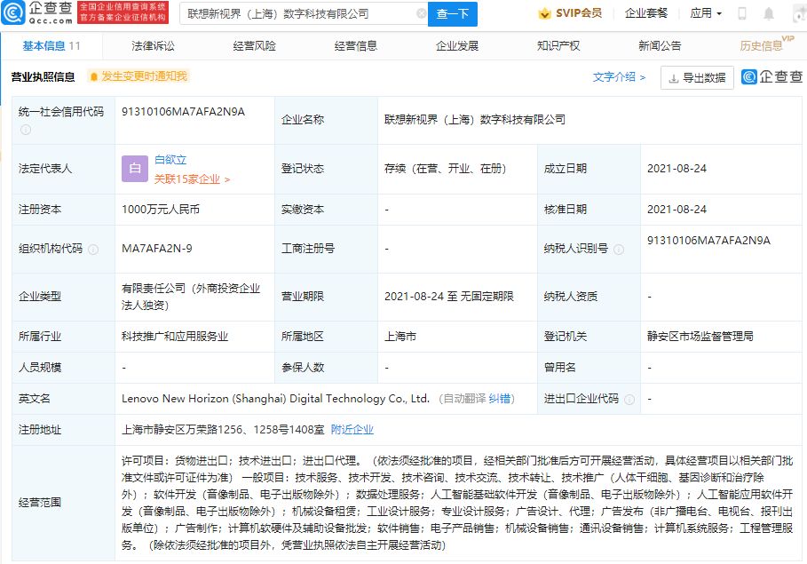 荔枝新闻讯 企查查显示,近日,联想新视界(上海)数字科技有限公司成立,法定代表人为白欲立,注册资本1000万元人民币,经营范围包含:软件开发;数据处理服务;人工智能应用软件开发等。