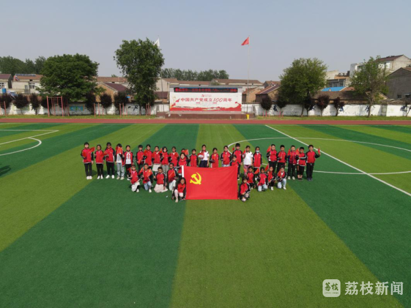 庄圩乡小学学生在篮球场上开展我与党旗合个影