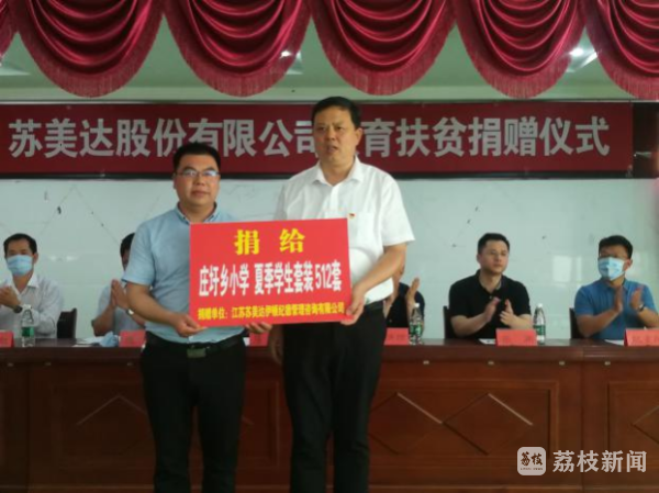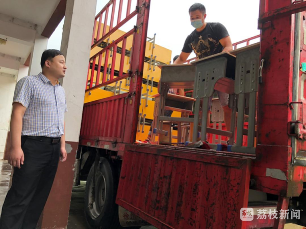 8月23日中午,泗阳县庄圩初级中学院内,接过乡里赠送300套课桌后,该校校长周希传向该乡连声感谢。